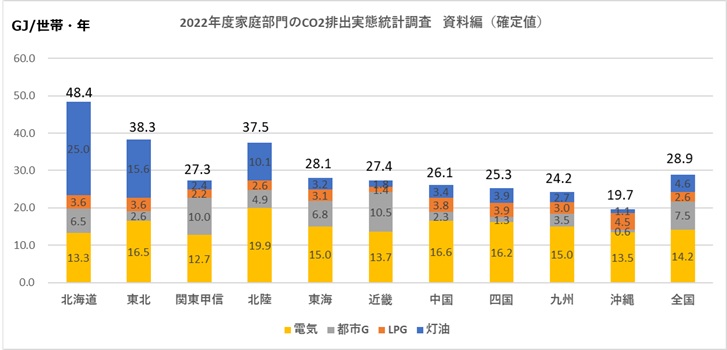 2022年度の公表値です。1世帯が1年間に消費したエネルギーは28.9GJで、電気が14.2GJ、都市ガスが7.5GJ、LPガスが2.6GJ、灯油が4.6GJとなっています。